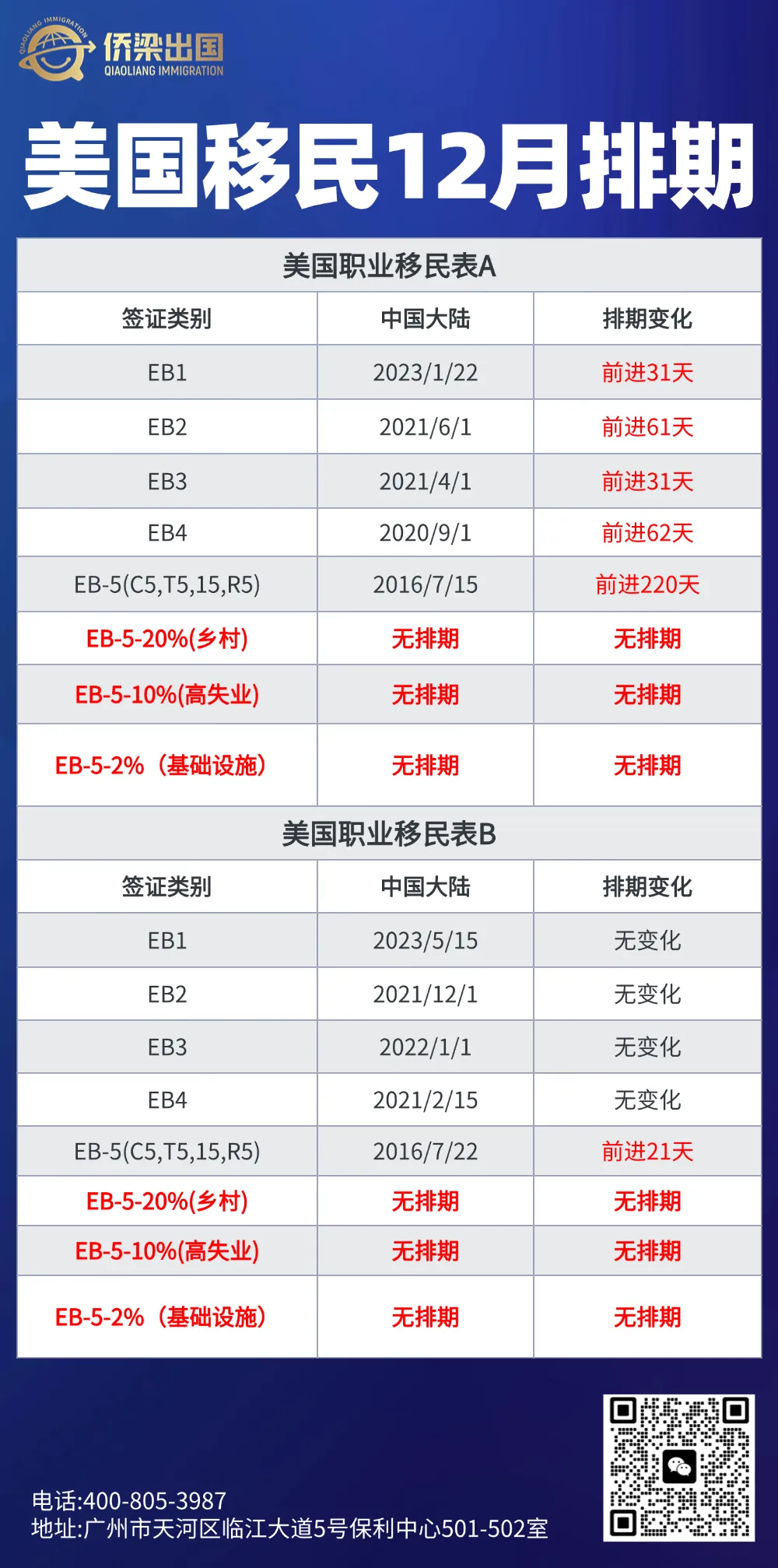职业移民排期整体呈现稳步推进态势:EB-1、EB-2、EB-3表A分别前进1-2个月,表B并无变化;