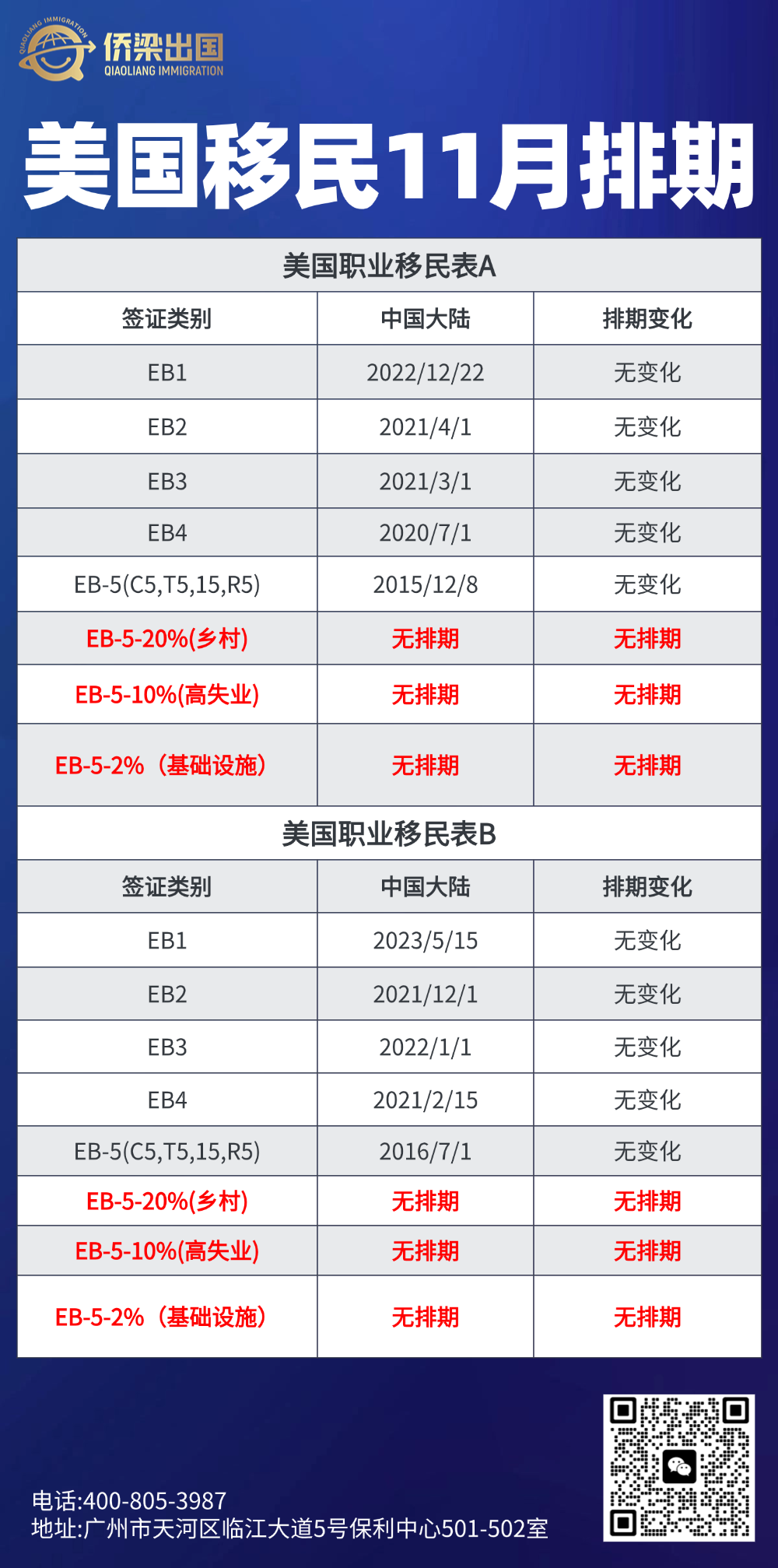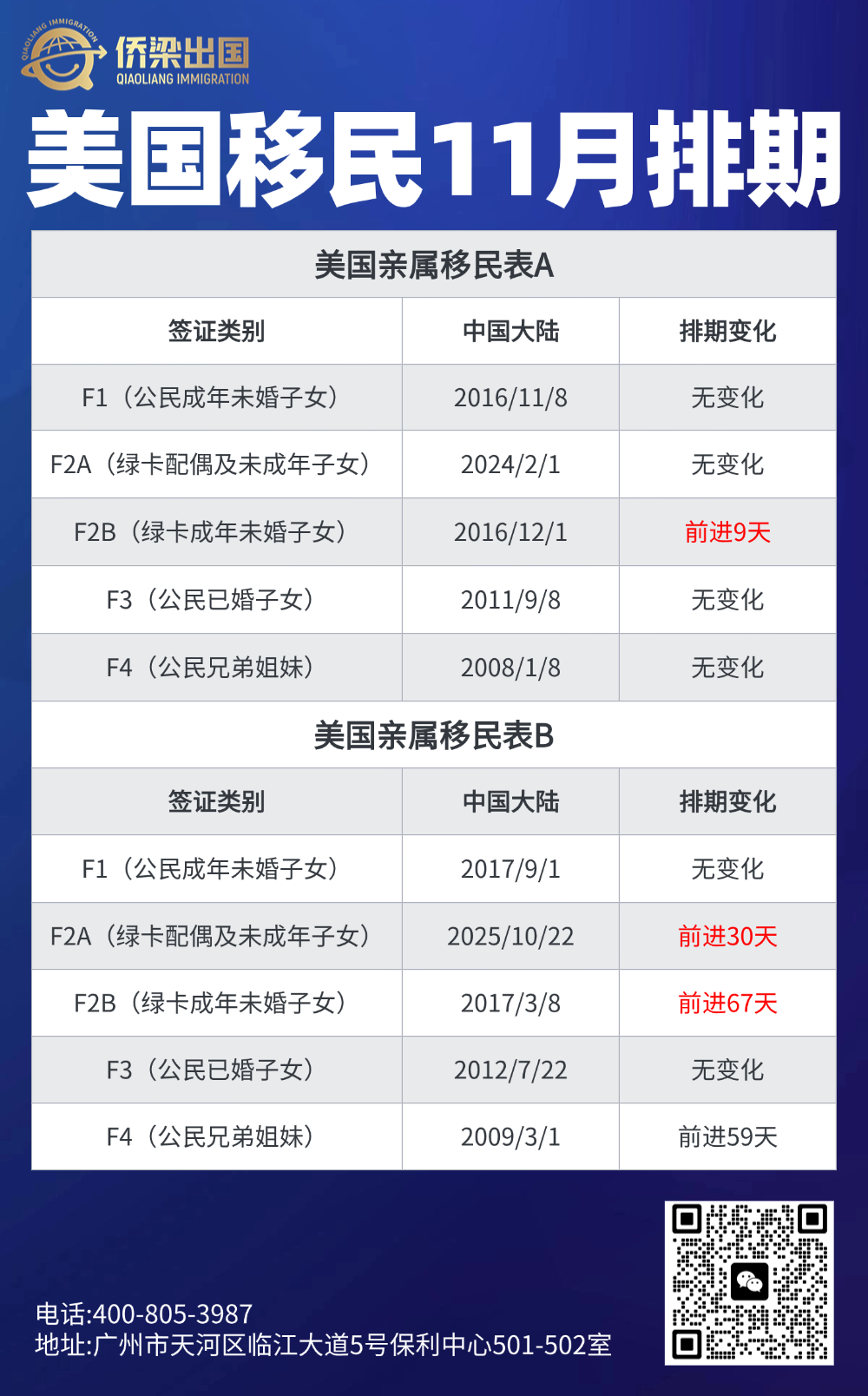 就在今天,美国国务院正式发布了2025年11月(2026财年第二个月)的签证排期表!