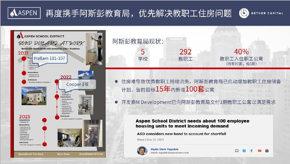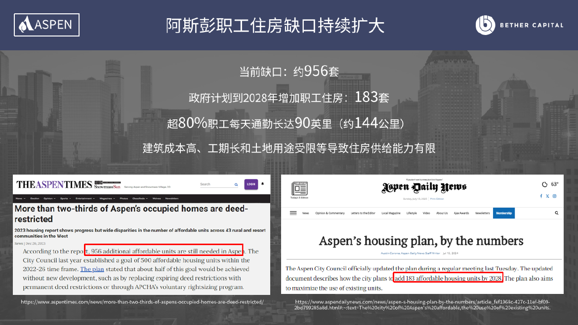据统计:阿斯彭职工住房缺口已达 956套,而政府规划到2028年仅能补供 183套;仅教育系统一项,全区292名教职工,只有40%享有局方住房,缺口严重。