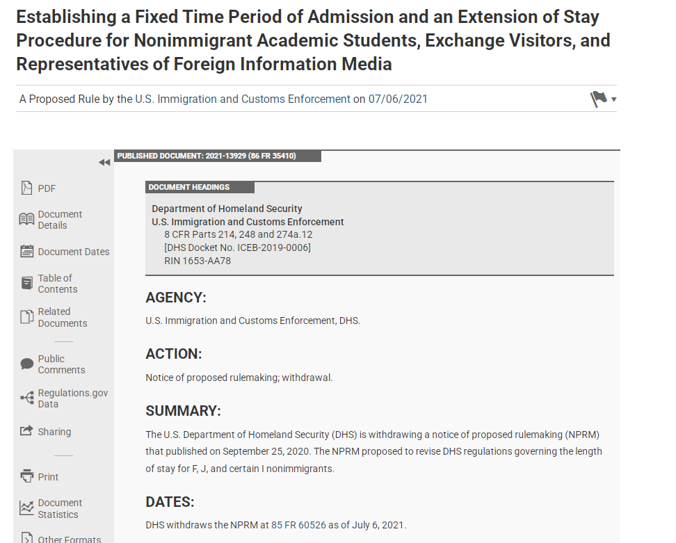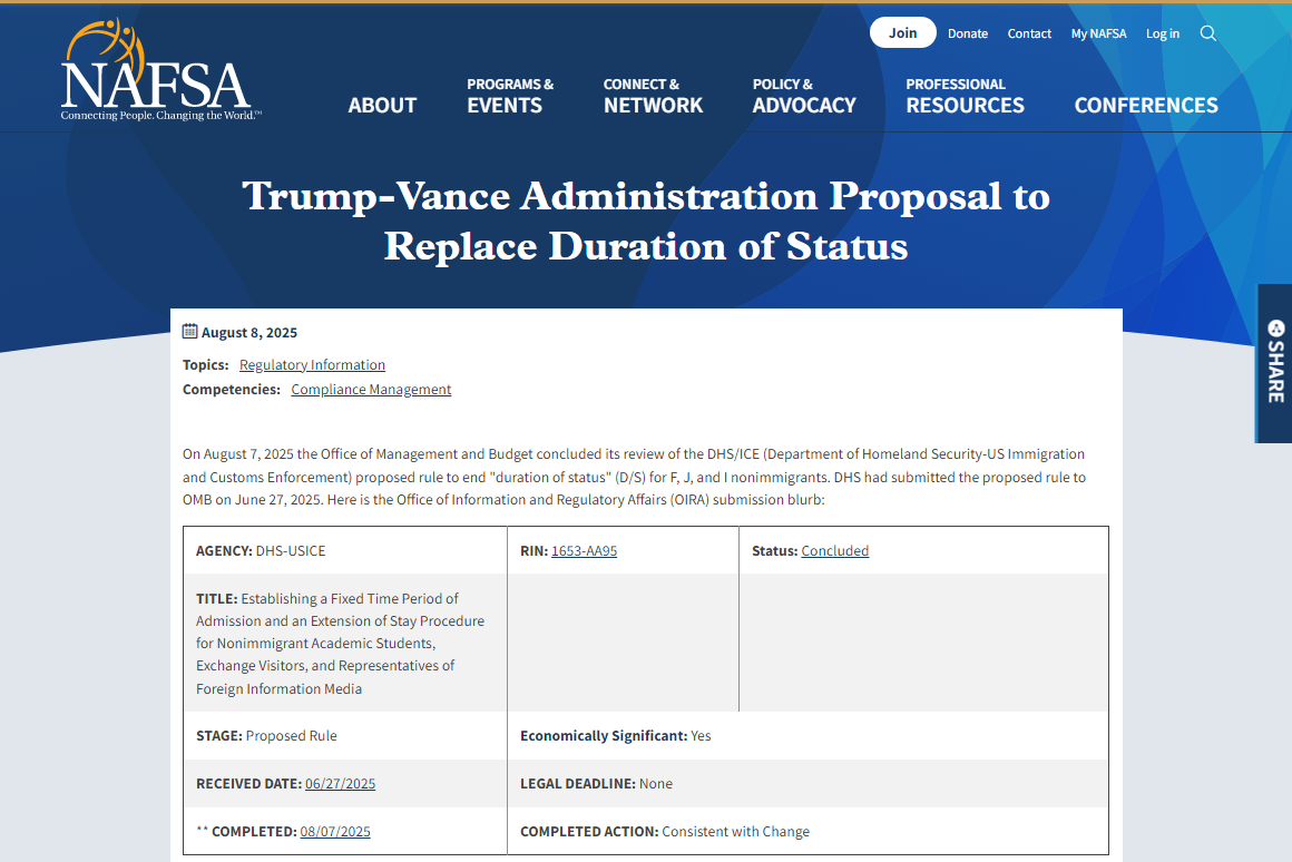 目前,DHS/USICE(美国国土安全部及移民与海关执法局)确实重新提出了一项拟议规则,针对F签(非移民学术学生)、J签(交流访问学者)和I签(外国新闻媒体代表)设立“固定入境期限与延长居留程序”。该政策的核心在于改变现有的D/S(Duration of Status)制度。