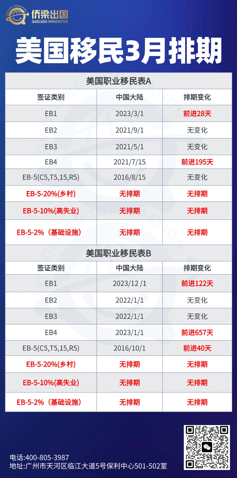 2026年3月美国移民排期表的亮点主要在两个类别: