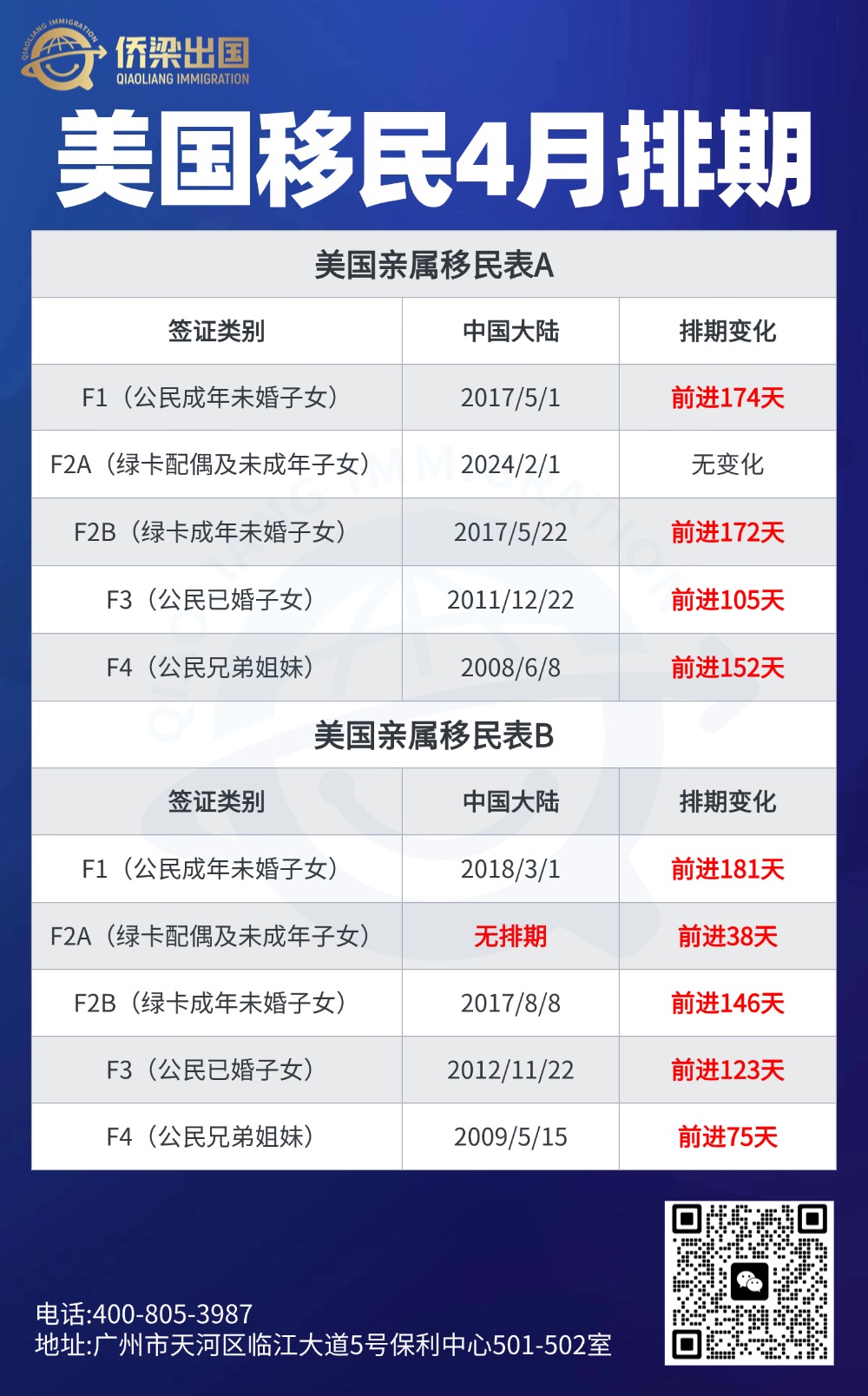 - F2A类别(配偶及未成年子女): 表B(递交日期)恢复至无排期状态,为申请人提供了极大的便利。