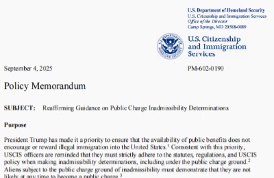 2025-09-17 美国移民重磅新规!USCIS宣布收紧“公共负担”审查,绿卡申请更难了!文章导读 2025 年 9 月4日,美国移民局(USCIS)发布政策备忘录,重申: 移民官在审查绿卡或签证申请时,将提高对“公...View details